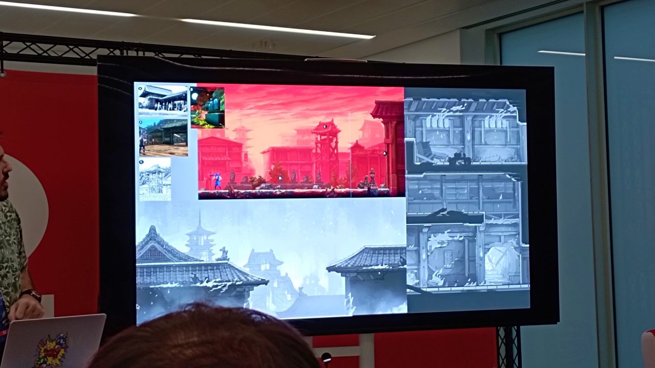 La decoradora & Pixel Artist de The Game Kitchen también nos mostró cómo se han trabajado los menús de NINJA GAIDEN: Ragebound, cogiendo de referencia el estilo de Sonic Mania y aprovechando el logotipo del juego para crear cada una de estas interfaces. Para que los programadores pudiesen entender cómo tenían que configurar estos menús dentro del juego, nos mostraron un interesante diagrama realizado con la herramienta Figma. En él, se mostraban diferentes clips con la visualización de ciertas animaciones de personajes, escenarios y menús para que así los programadores entendiesen fácilmente cómo había que plasmarlo dentro del motor gráfico del juego. Al ser una guía más visual, agilizaba mucho el trabajo.